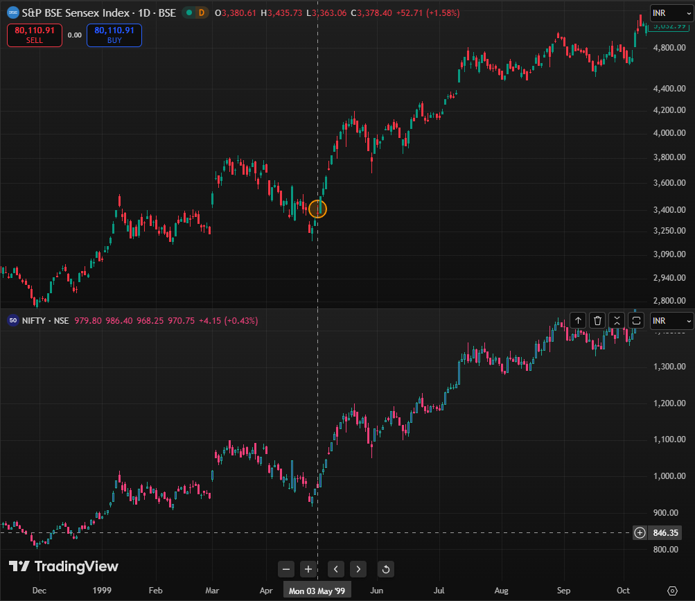 When combat officially began on May 3, 1999, the immediate reaction in the equity markets was negative. On that day, the Sensex opened at 3,380.61, touched a low of 3,363.06, and closed at 3,378.40, marking a decline of 1.58 percent. The Nifty opened at 979.80, fell to a low of 968.25, and ended the session at 970.75, registering a decline of 0.43 percent.