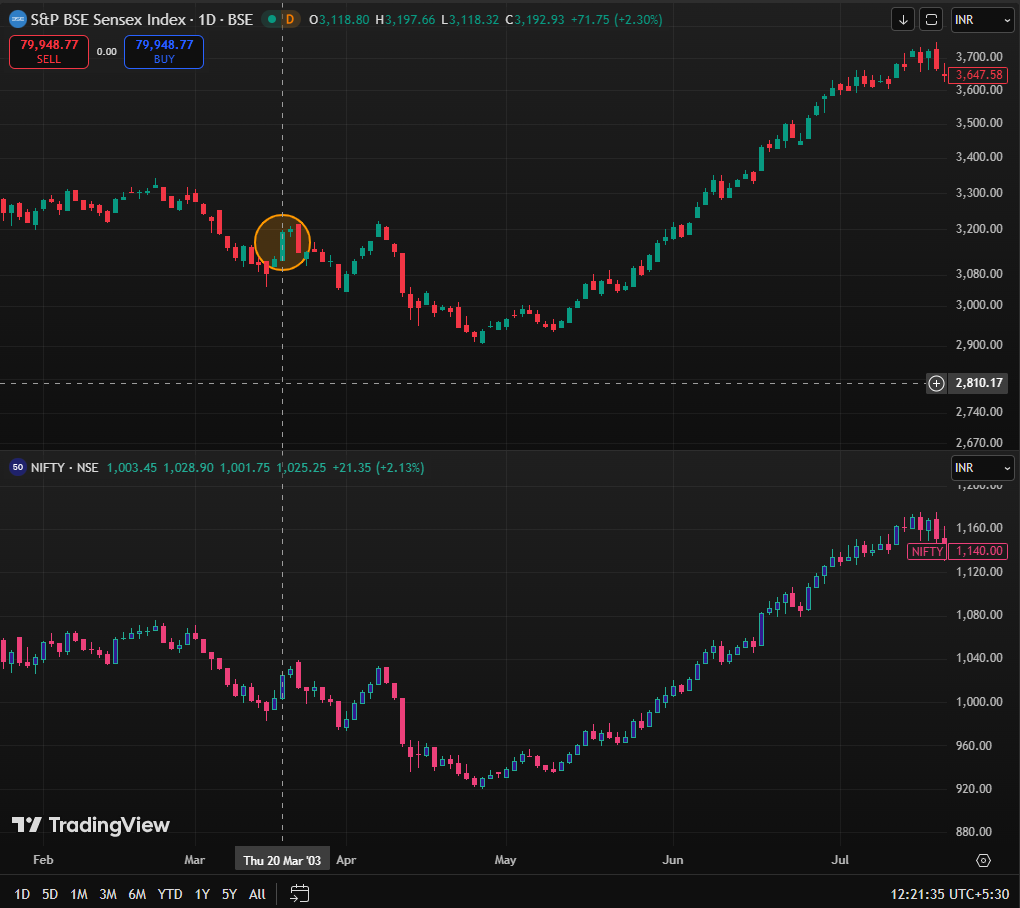 However, as the conflict continued, market sentiment weakened. From April 8, 2003, the Sensex began to show a downward trend, leading to a near 10 percent correction during the month of April 2003. The Nifty witnessed a similar near 10 percent decline during the same period. Despite this correction, the markets stabilised over the following weeks. By June 2003, the Sensex had recovered back to its pre-war levels, indicating that the initial volatility was temporary and that investor confidence returned as uncertainty reduced.