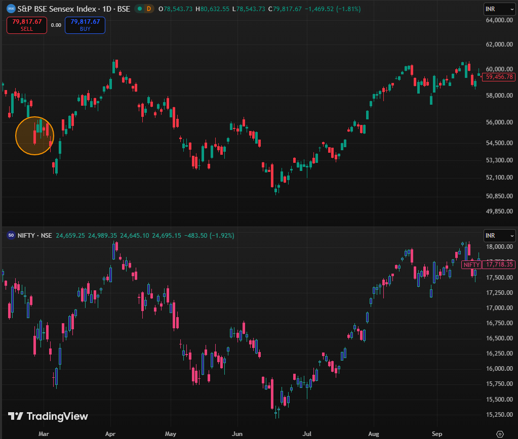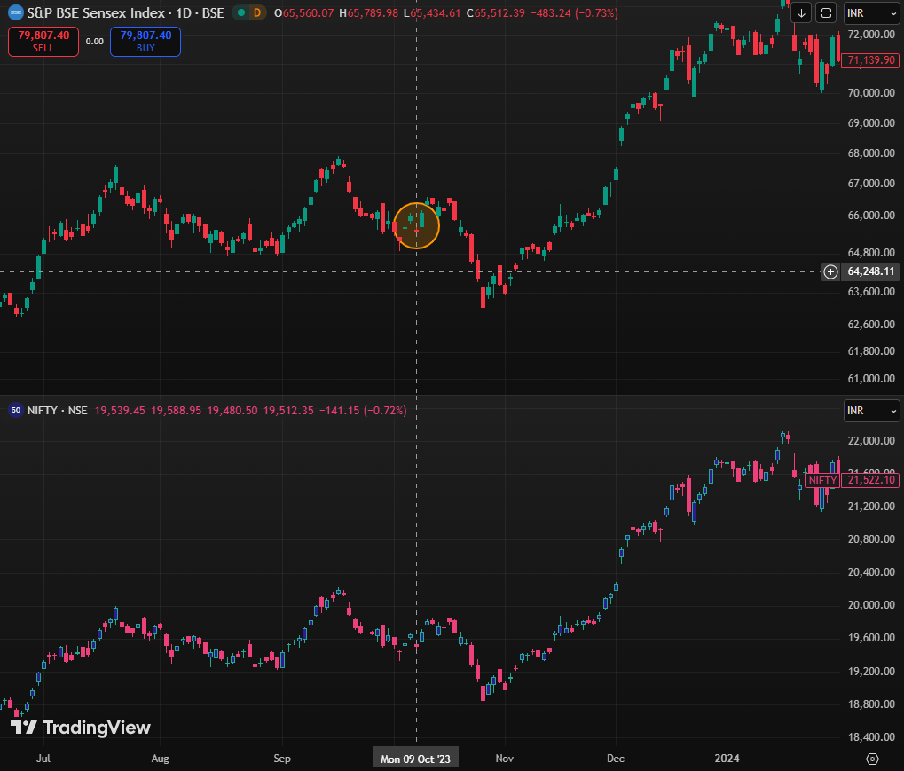 In the two trading sessions that followed, both the Sensex and Nifty recovered. However, markets slipped again, with indices correcting by over 5 percent. By October 26, 2023, the Sensex had fallen to 63,148.15. Despite this volatility, both the Sensex and the Nifty recovered to their pre-war levels by the end of November 2023, indicating that the market impact was temporary.