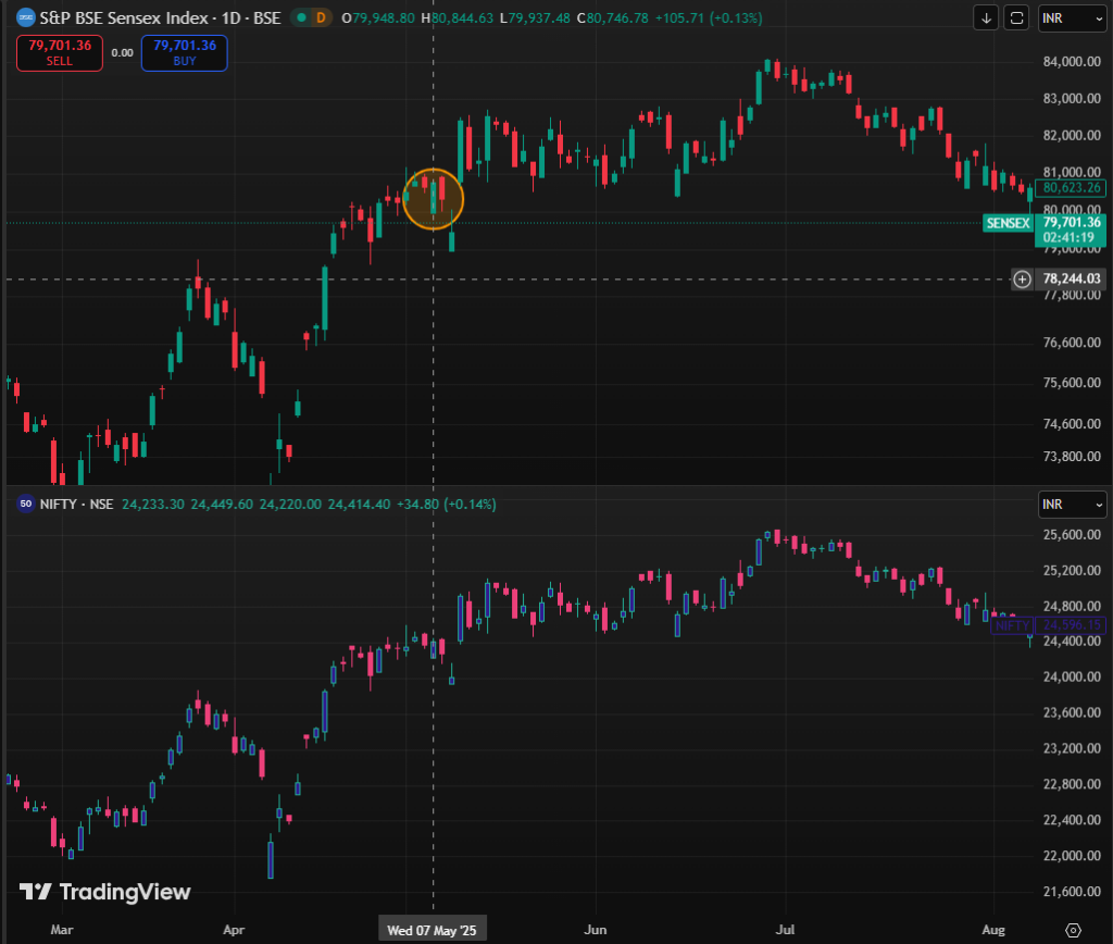 Markets initially reacted with caution. The Sensex fell nearly 700 points in pre-market trade, reflecting early nervousness. However, during the trading session on May 7, 2025, the indices stabilised. The Sensex opened at 79,948.80, touched a low of 79,937.48, and later rebounded to close at 80,746.78, marking an increase of 0.13 percent. The Nifty opened at 24,233.30, fell to a low of 24,220, and recovered to close at 24,414.40, registering a 0.14 percent gain.