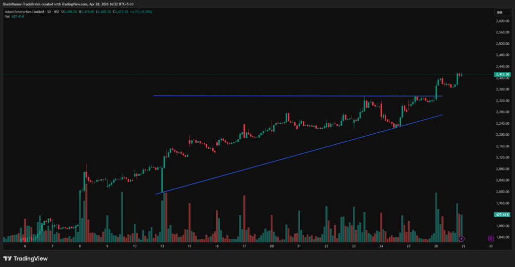 Synopsis: Adani Enterprises Ltd has formed an ascending triangle on the 30-min chart, signalling a possible short-term bullish breakout.