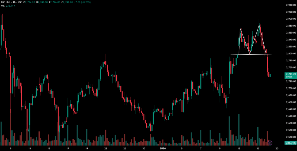 Synopsis:BSE Ltd has exhibited a bearish reversal pattern on its 1‑hour chart, signalling potential near-term downward momentum.