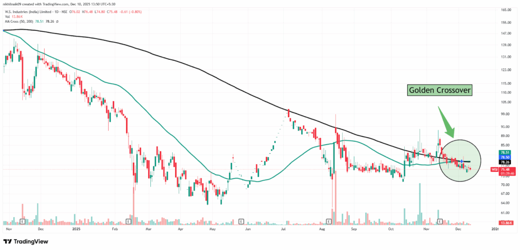 The golden crossover took place on December 03, 2025, at a price of Rs. 78.50 with decent volumes of 40.16 K shares. The stock closed at Rs. 75.43 in Tuesday’s session, reflecting a 0.87 percent decrease in the intraday trade.