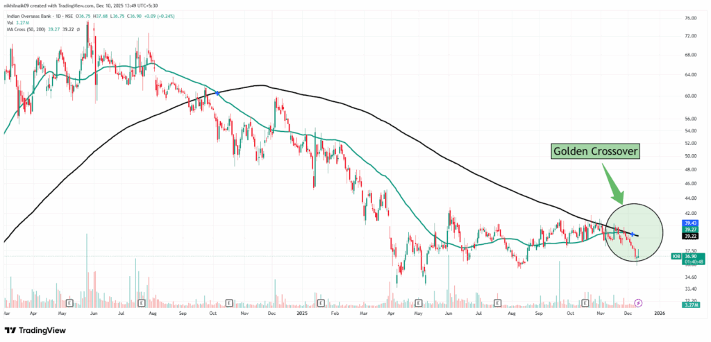 The golden crossover took place on December 04, 2025, at a price of Rs. 39.43 with decent volumes of 4.38 M shares. The stock closed at Rs. 36.64 in Tuesday’s session, reflecting a 0.46 percent decrease in the intraday trade.
