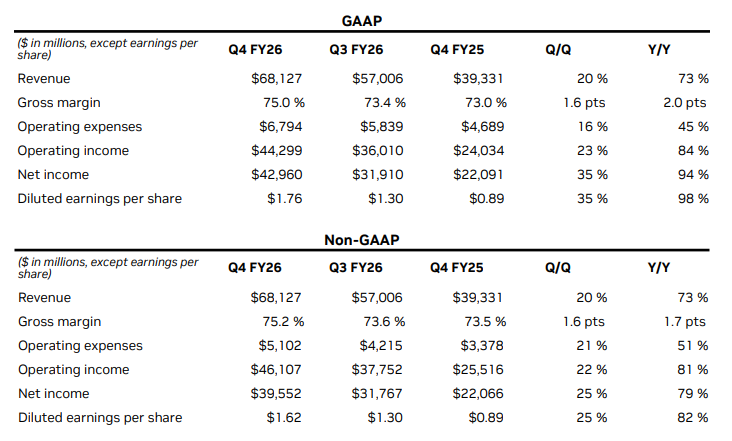 The company reported fourth-quarter revenue of USD 68.1 billion, marking a 73 percent increase year-on-year and a 20 percent rise sequentially. For the full fiscal year, revenue reached a record USD 215.9 billion, up 65 percent compared to the previous year. GAAP net income stood at USD 42.9 billion, up from USD 31.9 billion in Q3FY26, and Non-GAAP net income stood at USD 39.5 billion compared to USD 31.7 billion in Q3FY26.