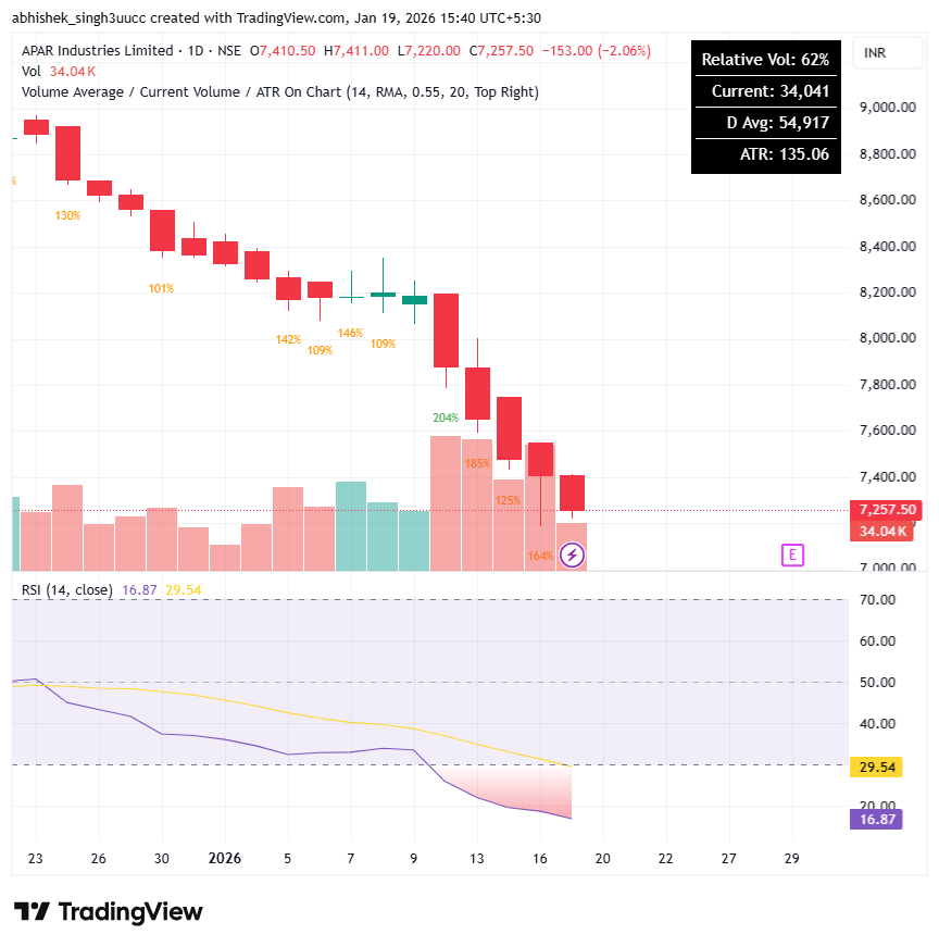 With a market capitalization of Rs. 29,044 crores on Monday, the stock closed at Rs 7,234 apiece, with an RSI of 16.87, indicating that it is in the oversold zone, offering the potential for an upside bounce.